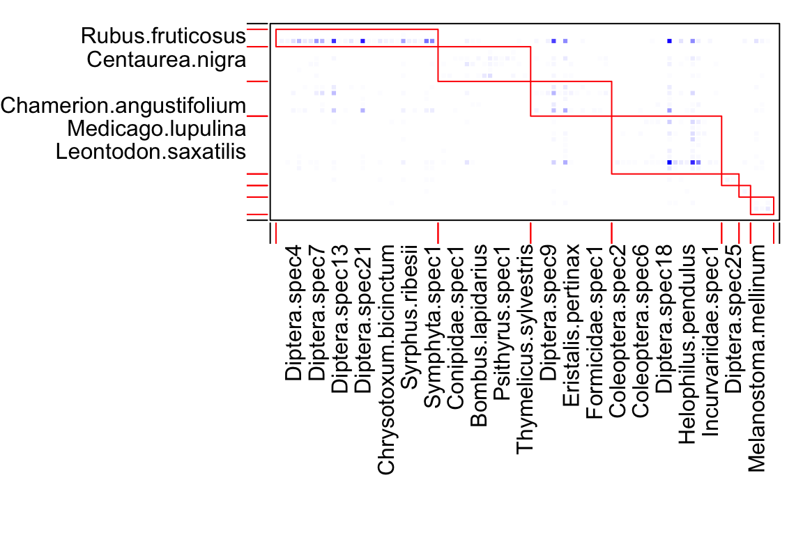 maximizes a modularity function for weighted bipartite networks (Dormann et al.