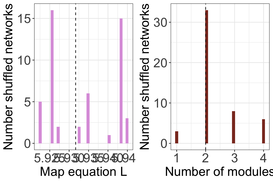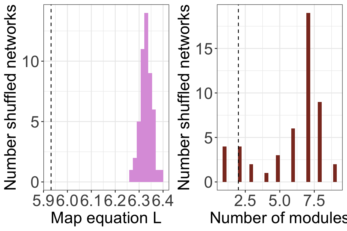 trials argument in run_infomap_monolayer.Hypothesis testing is a whole world. Here we just described the basis. I recommend reading (Gotelli and Ulrich 2012). In that paper they also mention process-based null models, which are a whole different class of concepts and methods. Here are three main topics that you will probably need to go deeper into when you analyze your on data: